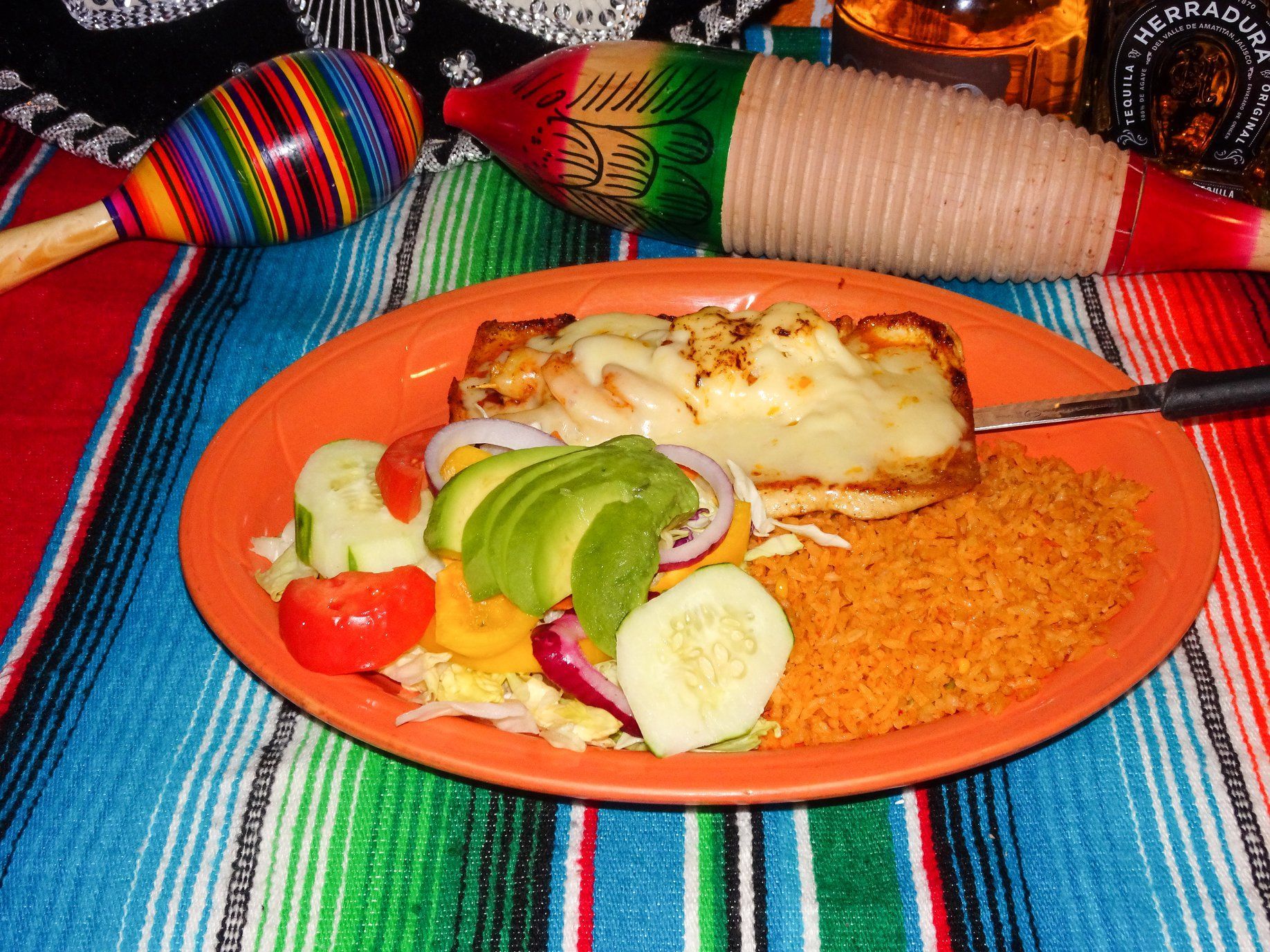 grilled chicken, fiesta rice and bean. Covered with a mile red sauce, shredded