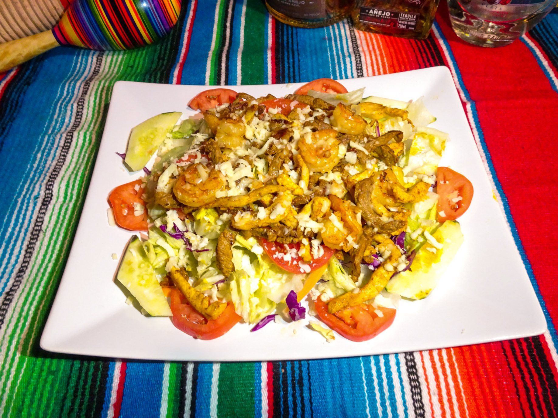 cheese sauce and pico de gallo. Served with > a fresh salad and fiesta rice.